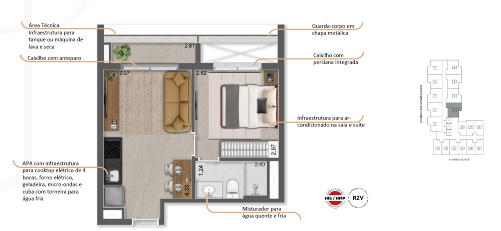 Com 482 unidades, o Terrare Moema oferece apartamentos de 1 dormitório com metragens de 33 m² e 33,75 m², além de studios entre 20,50 m² e 21,35 m², enquadrados nas modalidades HMP, HIS e R2V-4. As plantas foram concebidas com racionalidade espacial e infraestrutura completa, incluindo terraço com porcelanato, guarda-corpo metálico, previsão para máquina lava e seca, infraestrutura para ar-condicionado tipo split na sala e no dormitório, aquecimento central com água quente em lavatórios e chuveiros, ponto elétrico para cooktop (2 bocas nos studios e 4 bocas nas unidades de 1 dormitório) e ausência de ponto de gás, reforçando a proposta elétrica do empreendimento. O sistema construtivo é convencional, com estrutura em concreto, vedação em blocos e paredes internas em drywall, lajes de 12 cm e pé-direito piso a piso de 2,72 m.